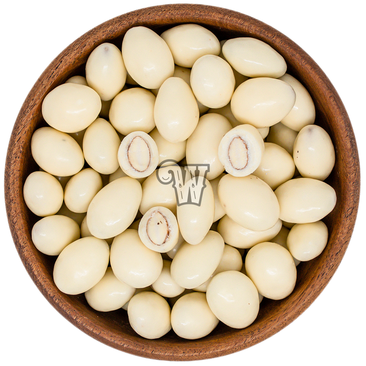 Almendra tostada cubierta con chocolate cobertura blanca.